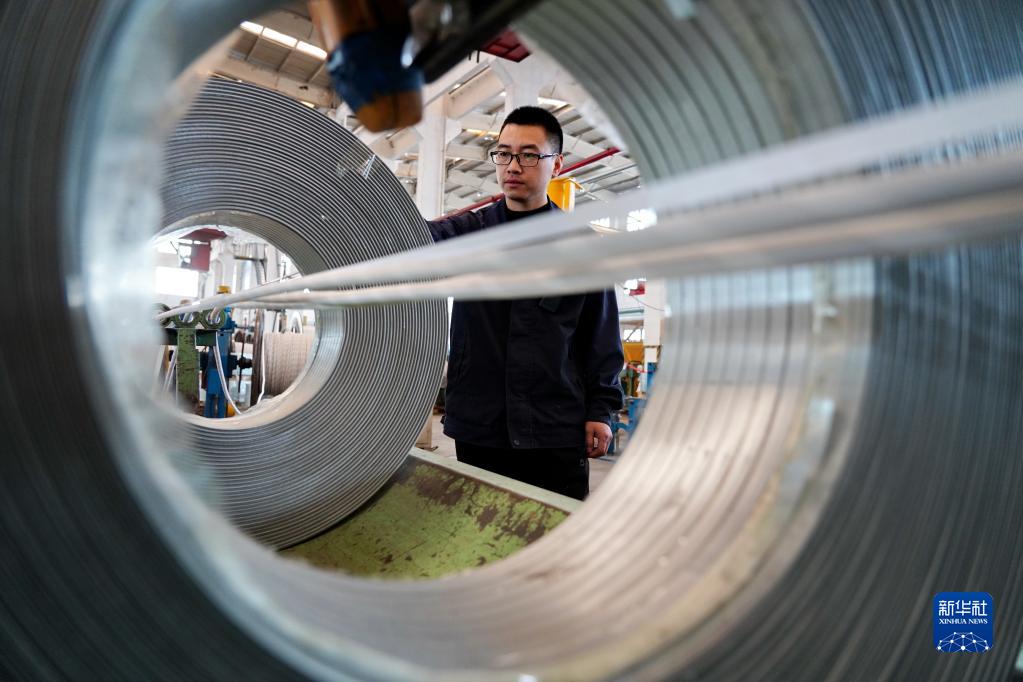 4月13日,唐山市一家線纜出口企業的工人在車間內工作。