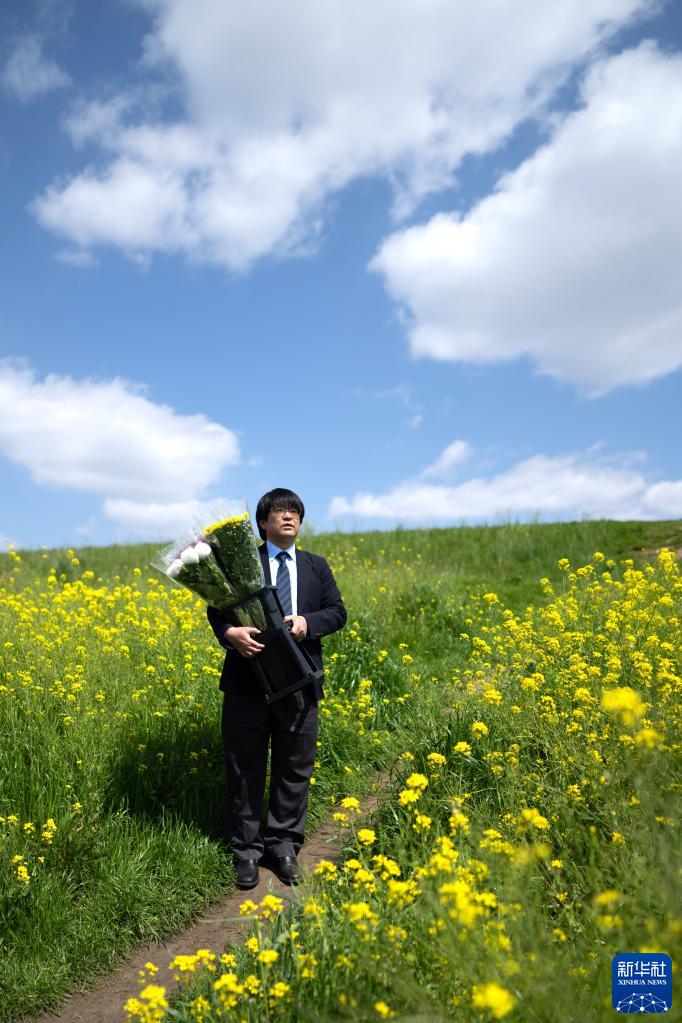 在日本埼玉縣三鄉(xiāng)市,小西武準備開車去給訂貨花店送花時路過一片花田(4月3日攝)。在日本的埼玉縣,小西武2022年創(chuàng)立了自己的花卉公司,從中國云南進口鮮切花,銷售給分銷商、鮮花加工廠以及花店。他最近一批進口鮮花來自云南開遠。