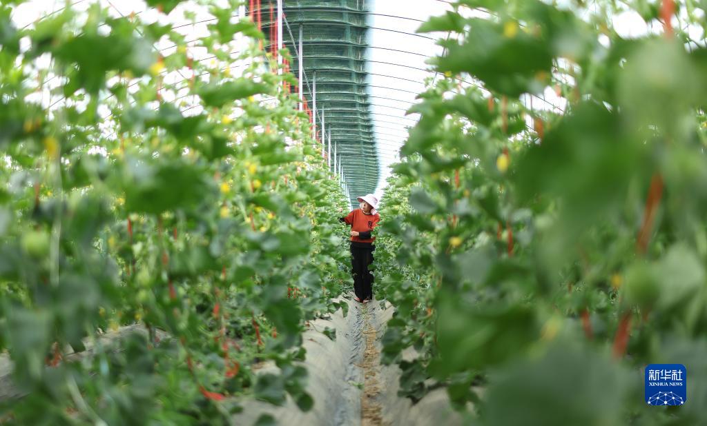 4月13日,農民在山東省臨沂市臨沭縣大興鎮一處甜瓜種植大棚內進行田間管理。