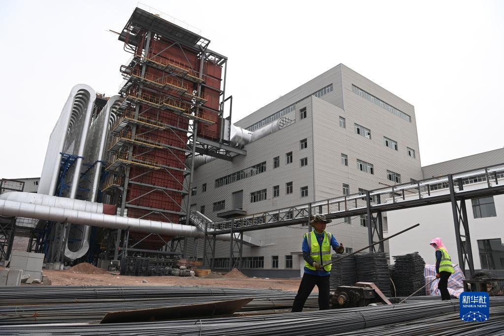 4月13日,工人在位于張掖市甘州區的20萬噸硅系新材料綜合利用項目建設現場施工。
