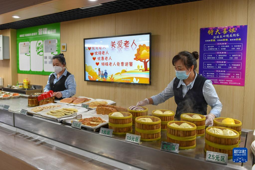 4月11日,在吉林省長春市朝陽區光明社區食堂,工作人員在擺放菜品。該食堂是吉林省民政廳重點支持的100個社區老年食堂之一。