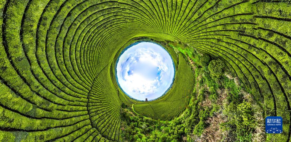4月4日拍攝的遵義市湄潭縣永興鎮“萬畝茶海”(無人機全景拼接照片)。