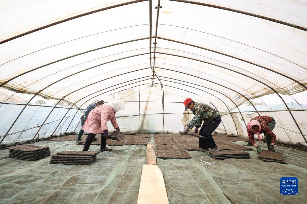 4月14日,盤錦市盤山縣的農戶在進行水稻秧苗育苗工作。