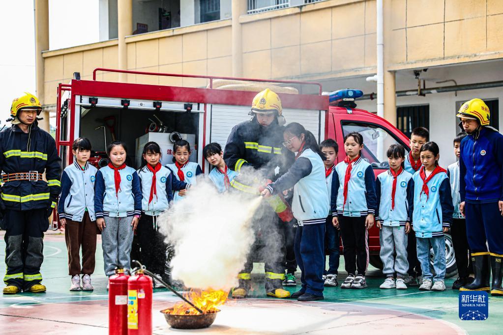 4月13日,在江西省撫州市南豐縣傅坊鄉(xiāng)中心小學(xué),消防員為學(xué)生示范滅火器的使用方法。