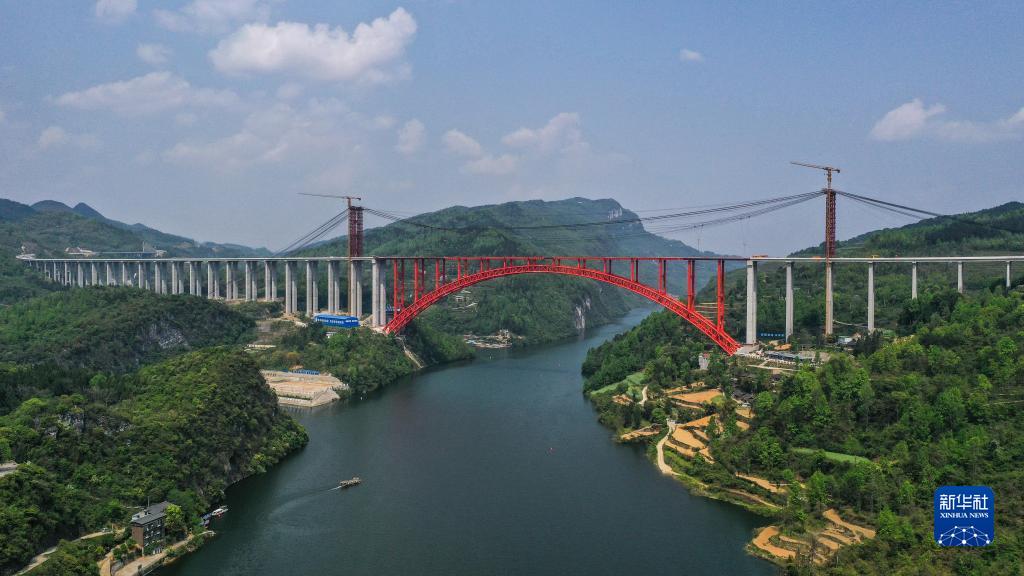 4月11日拍攝的貴州德余高速烏江特大橋建設(shè)現(xiàn)場(chǎng)(無(wú)人機(jī)照片)。