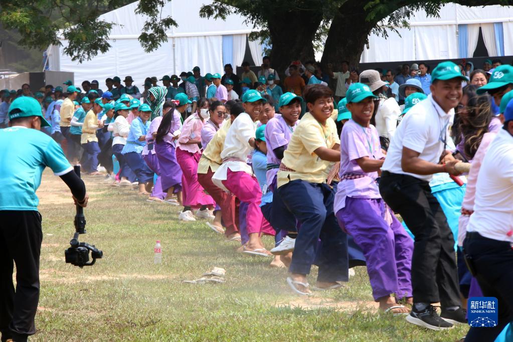 4月14日,在柬埔寨暹粒吳哥古跡內(nèi),人們?cè)谒胃晒?jié)慶祝活動(dòng)上參與傳統(tǒng)拔河游戲。