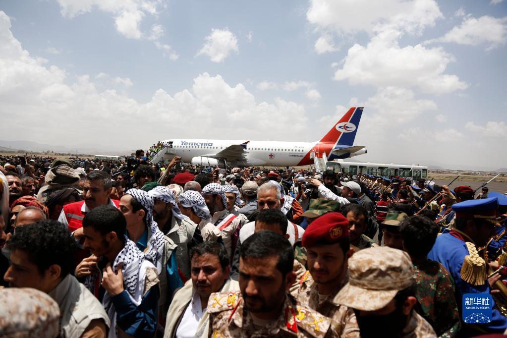 4月14日,在也門薩那機(jī)場,人們迎接獲釋的胡塞武裝成員戰(zhàn)俘。