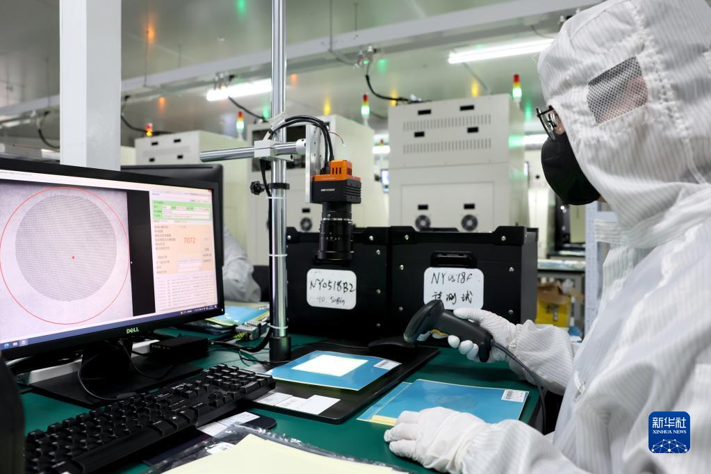 4月14日,一位工人在江蘇省射陽縣江蘇暖陽半導體科技公司LED芯片生產車間工作。