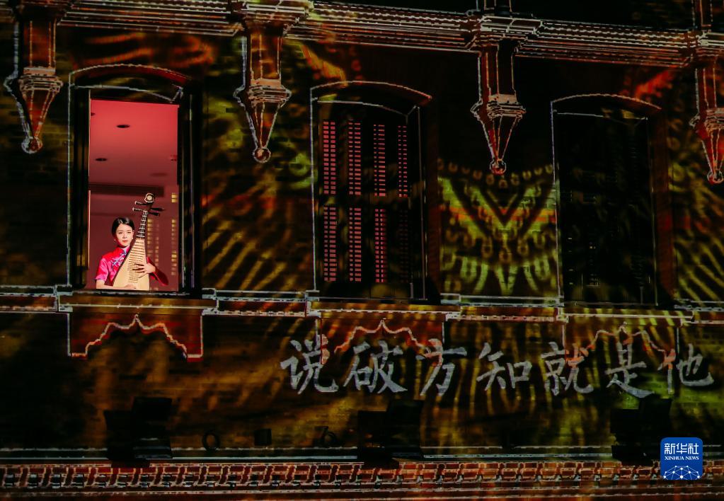 優秀歷史建筑“三聯排”在聲光影效果中,成為如夢似幻的戲曲舞臺(4月14日攝)。