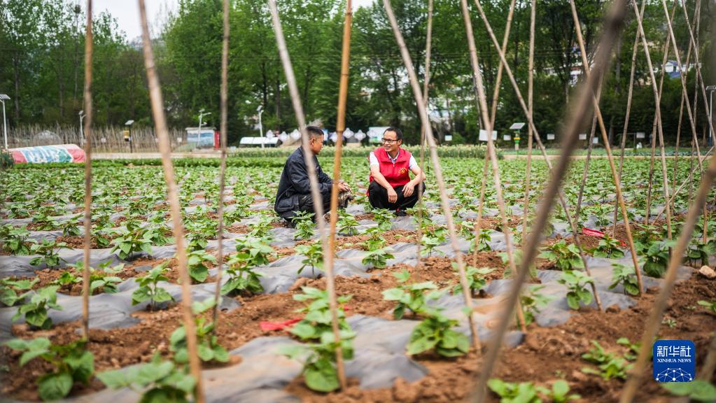 4月14日,農技工作者在六盤水市鐘山區大河鎮大橋村和村民交流蔬菜種植技術。
