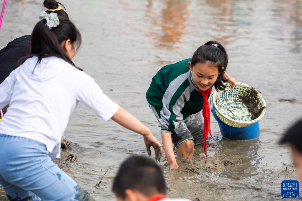 當日,在湖南省長沙市寧鄉市灰湯鎮花果山村舉行的農耕民俗文化節學生研學活動中,孩子們通過開展稻田插秧、捉泥鰍等“農趣” 比賽,走進田間地頭,感受勞動帶來的艱辛與快樂。