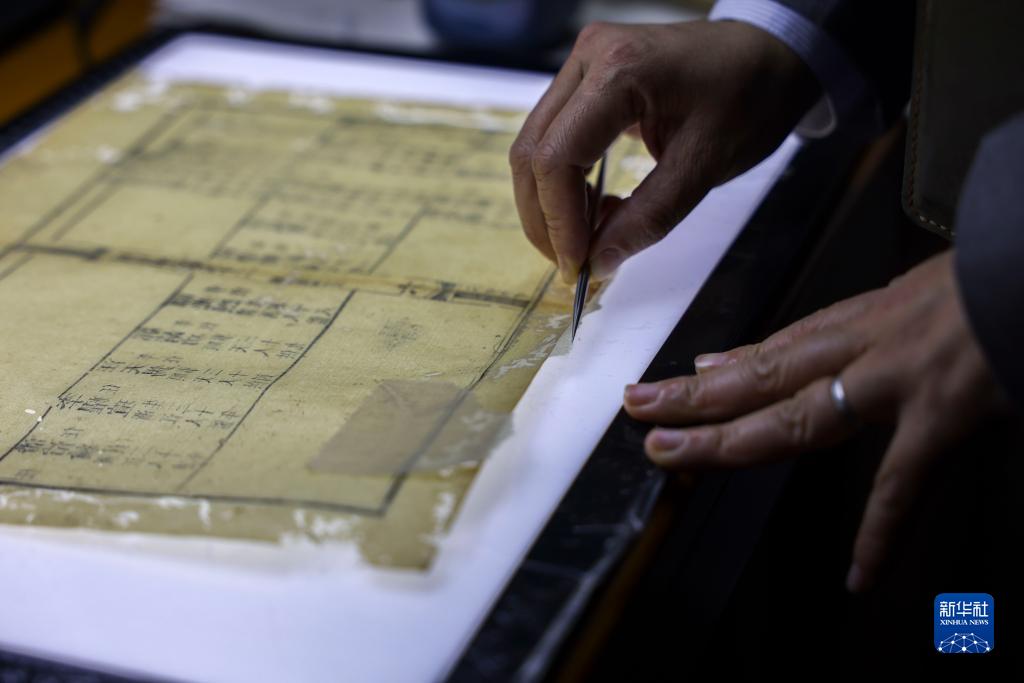 4月14日,在廣西壯族自治區(qū)圖書館古籍保護(hù)中心的工作室內(nèi),黃玉杏使用鑷子修補(bǔ)古籍。
