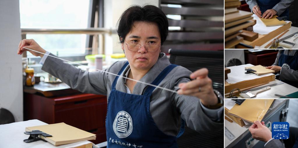 拼版照片:4月14日,在廣西壯族自治區圖書館古籍保護中心的工作室內,黃玉杏給修補好的古籍釘線。