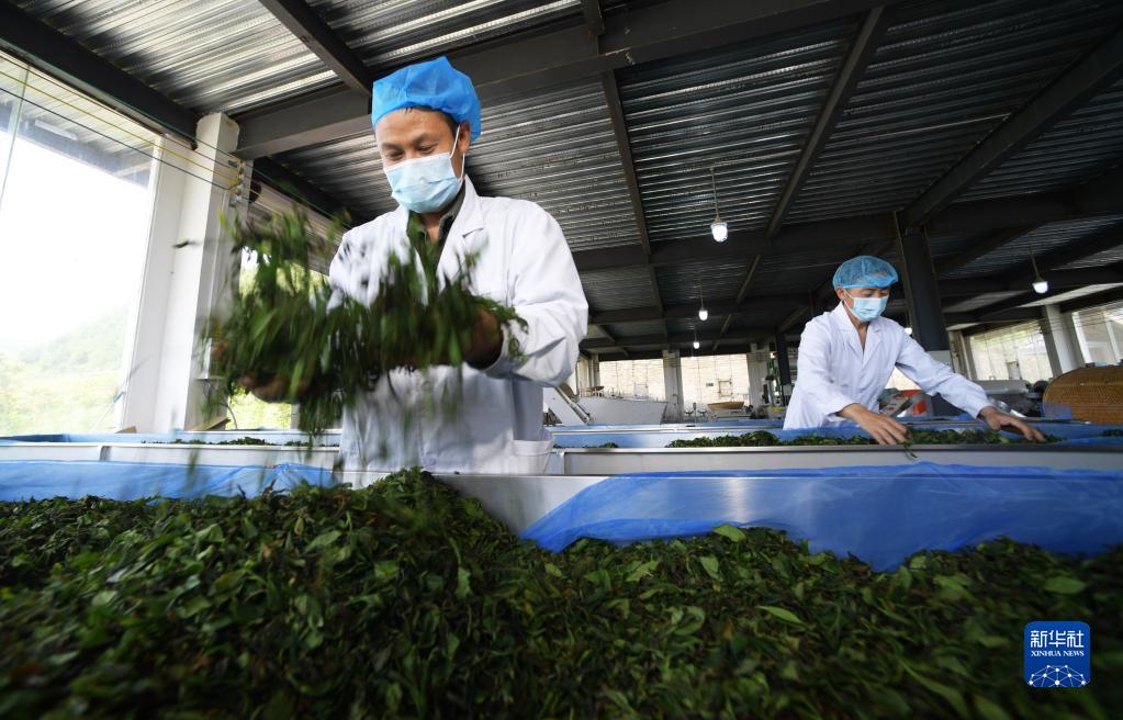 4月15日,工作人員在貴州省開陽縣南龍鄉田坎村一制茶廠制茶。