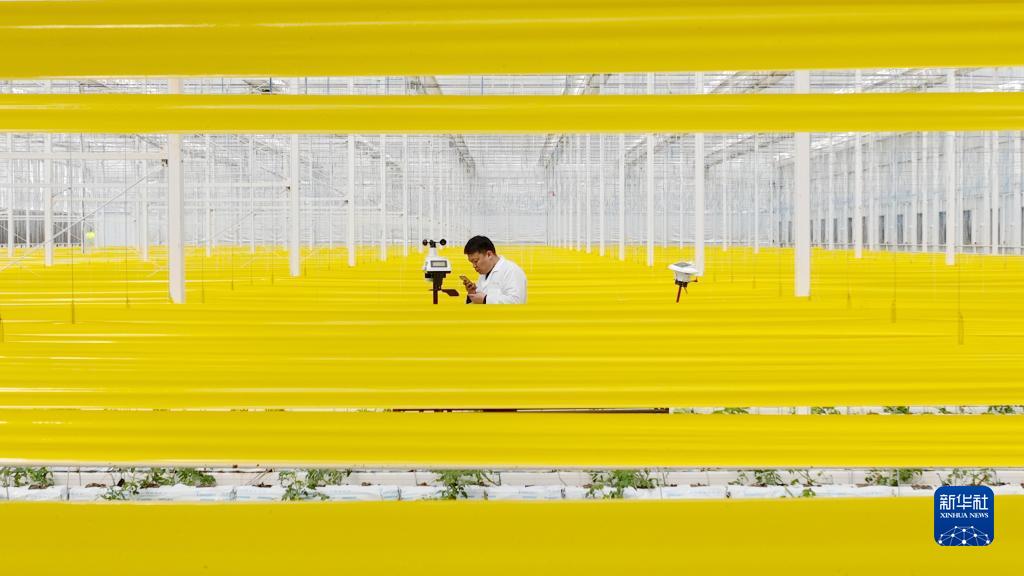 4月7日,在浙江省湖州市德清縣阜溪街道龍勝村水木“未來農(nóng)場”,技術(shù)人員觀察番茄智能大棚光照數(shù)據(jù)(無人機(jī)照片)。