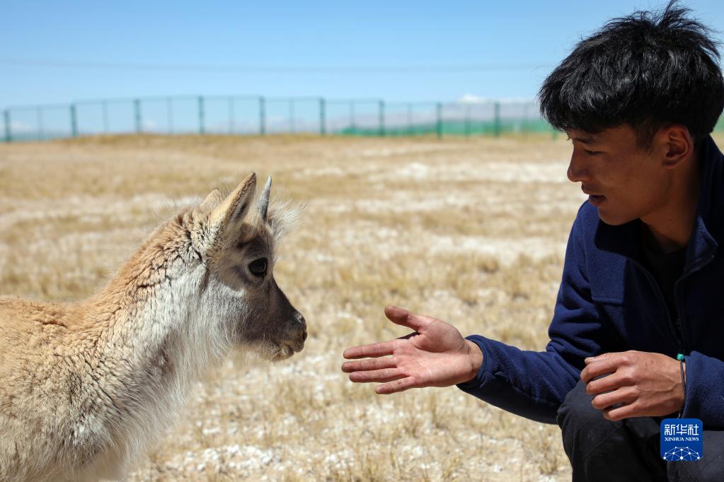 4月15日,索南達(dá)杰保護(hù)站巡山隊(duì)員才文多杰與被救助藏羚羊幼崽互動(dòng)。