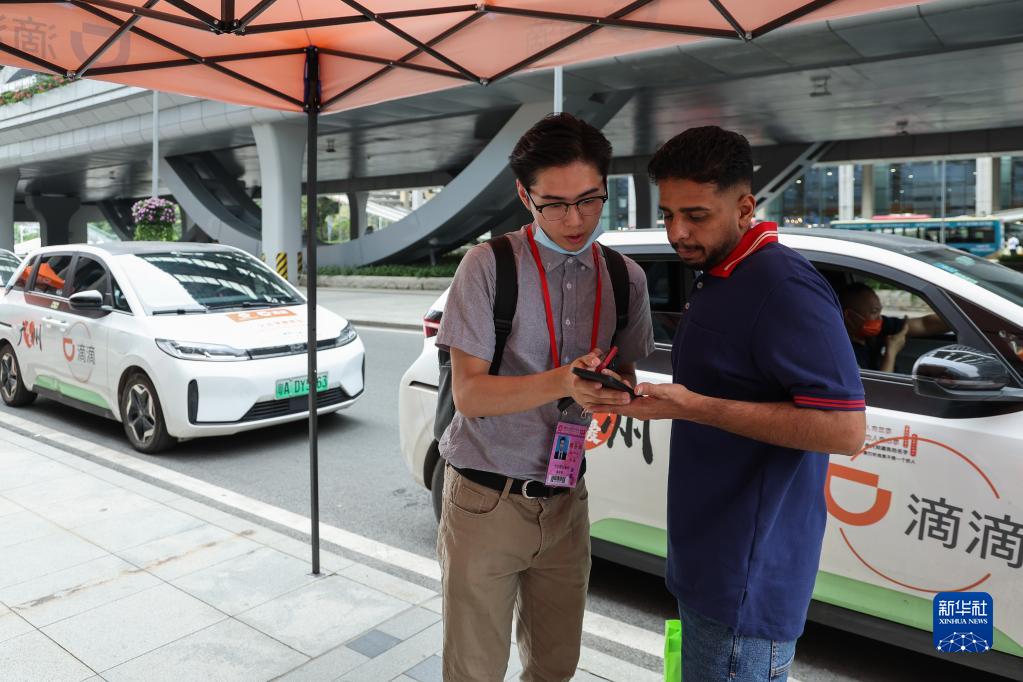 4月15日,一位外國客商在服務人員幫助下學習使用網約車打車軟件。本屆廣交會專門在場館區域設置了網約車乘車點,方便客商便捷通行。