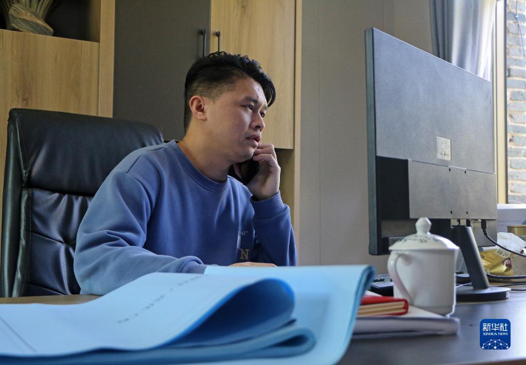 包希孟在辦公室打電話討論旅游項(xiàng)目的推廣事宜(4月7日攝)。