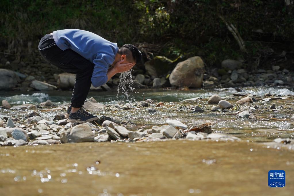 包希孟在小溪邊洗臉,他說清涼的溪水拍打在臉上還是小時候的感覺(4月7日攝)。