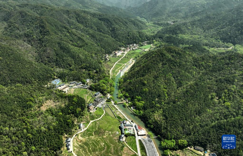 九嶺山環抱中的港背村(4月7日攝,無人機照片)。