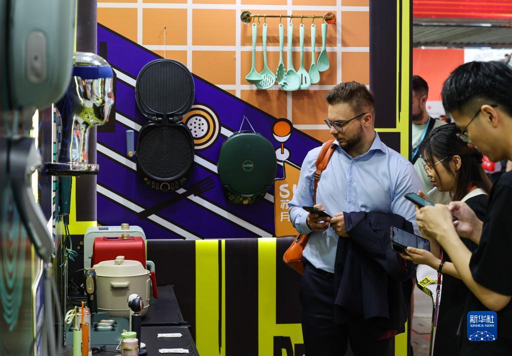 4月15日,采購商在第133屆廣交會上了解一家中國工業設計企業的廚房電器展品。