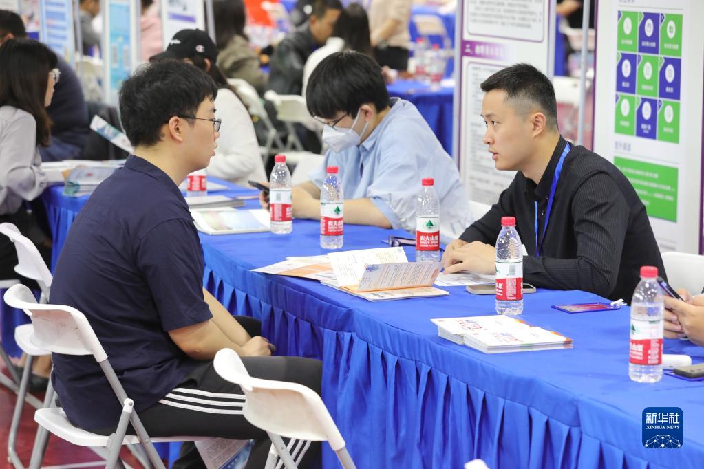 4月16日,學(xué)生(左)在春季雙選會(huì)現(xiàn)場(chǎng)與用人單位交流。