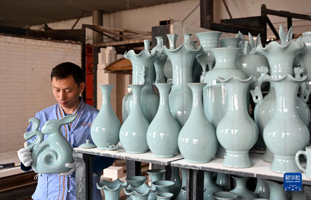 4月14日,在河南省汝州市一家汝瓷生產(chǎn)車間內(nèi),工人在查看出窯的汝瓷產(chǎn)品。