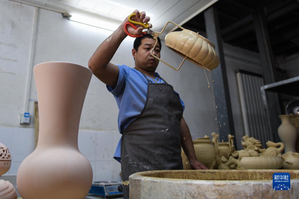 4月13日,在河南省汝州市一家汝瓷生產車間內,工人在為素胎施釉。