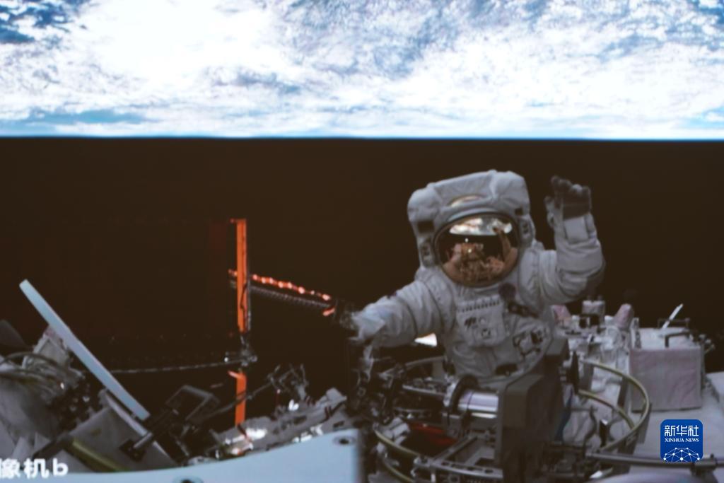 4月15日在北京航天飛行控制中心拍攝的神舟十五號航天員張陸結束出艙任務返回問天實驗艙時揮手致意的畫面。