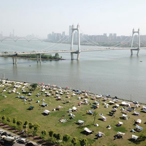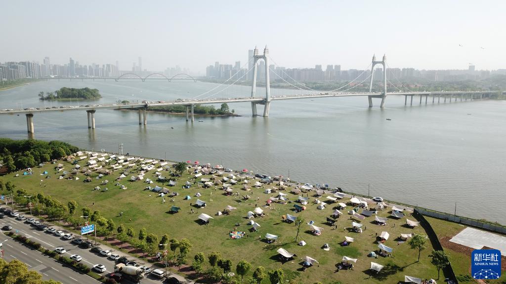 4月16日,市民在長沙市開福區湘江畔露營休閑(無人機照片)。