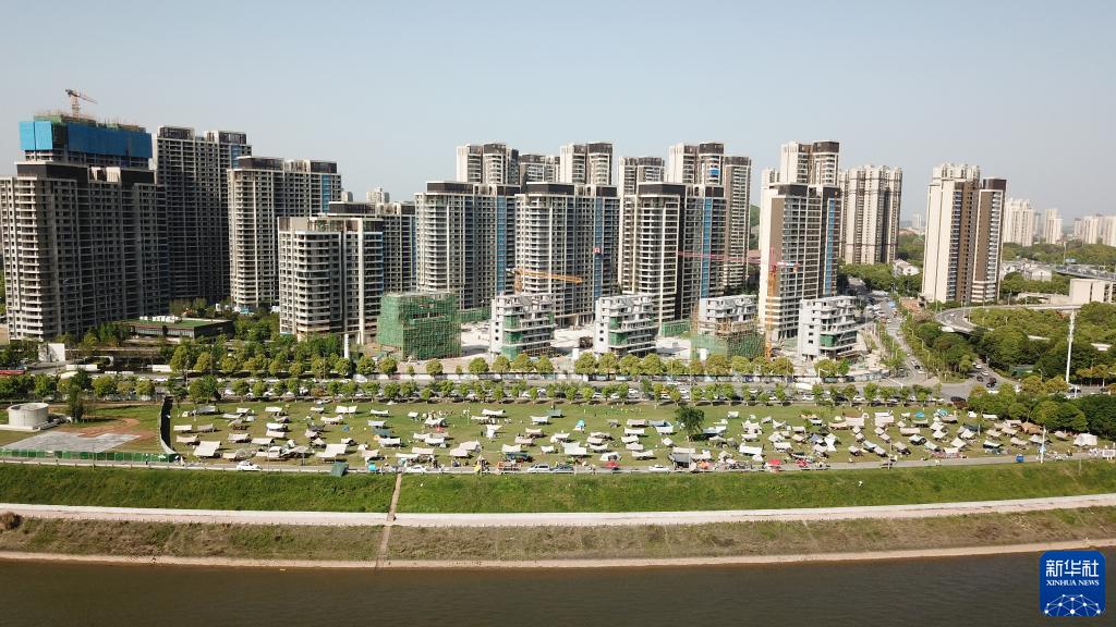 4月16日,市民在長沙市開福區湘江畔露營休閑(無人機照片)。