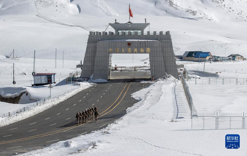 4月13日,邊防連官兵在紅其拉甫國(guó)門(mén)巡邏。