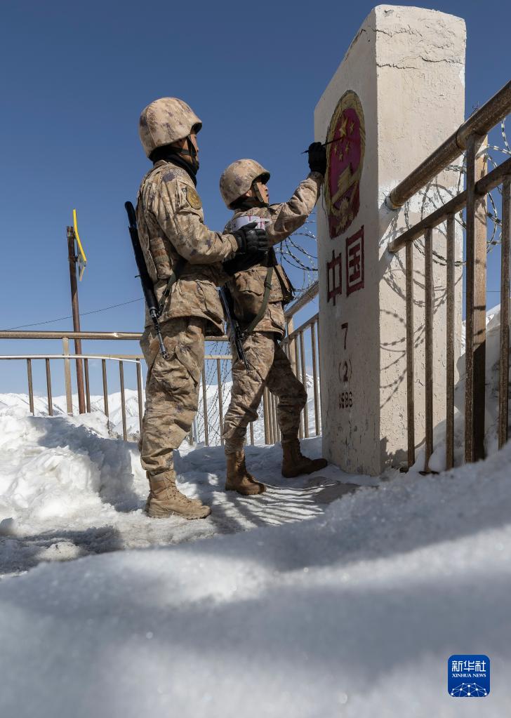4月13日,周林平(右)和高光輝執勤時給界碑描紅。