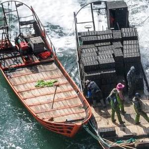 4月16日,在山東省榮成市愛倫灣海洋牧場,養殖工人從福建的船只上卸載鮑魚。