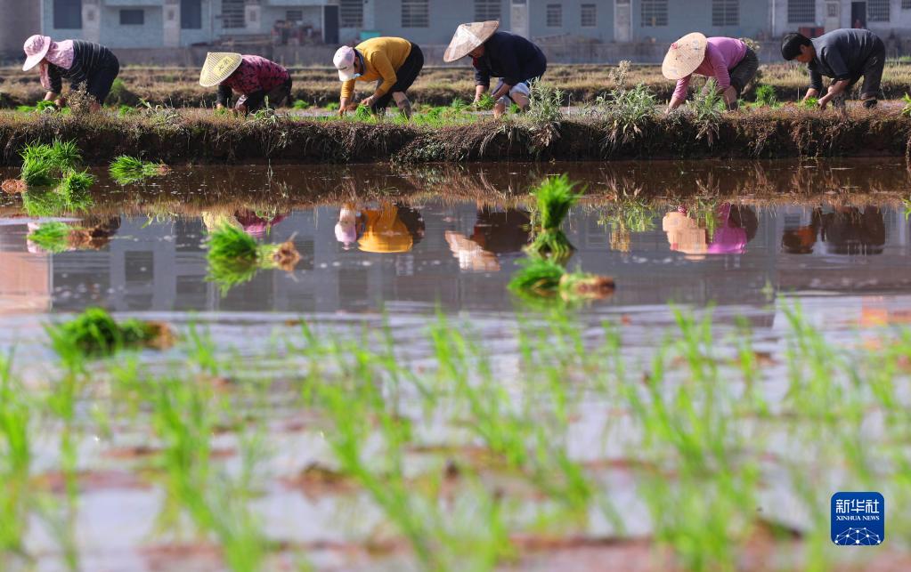 4月16日,在湖南省衡陽市祁東縣金橋鎮,村民在搶插早稻。