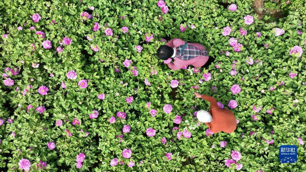 4月17日,河北省柏鄉縣十里鋪村花農在牡丹種植園里采摘牡丹鮮切花(無人機照片)。