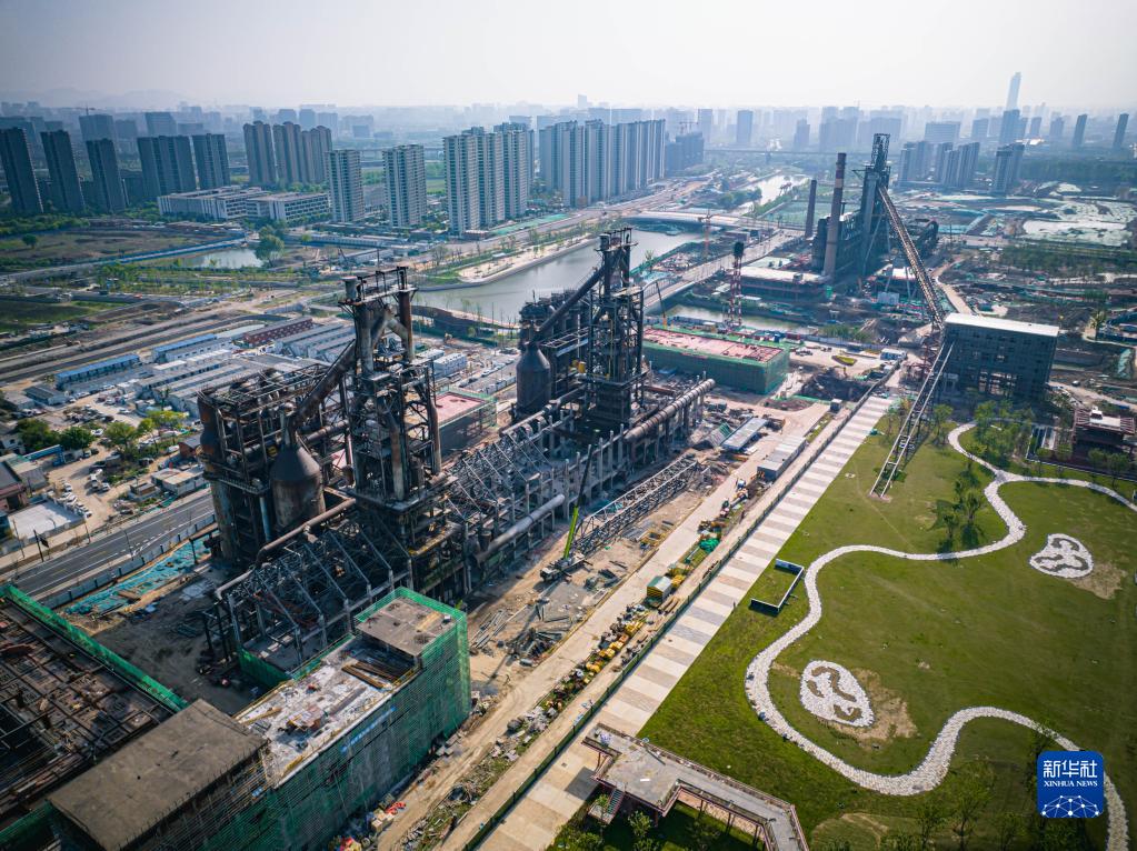 杭鋼工業舊址公園內改造中的煉鐵高爐等工業遺存(無人機照片,4月17日攝)。