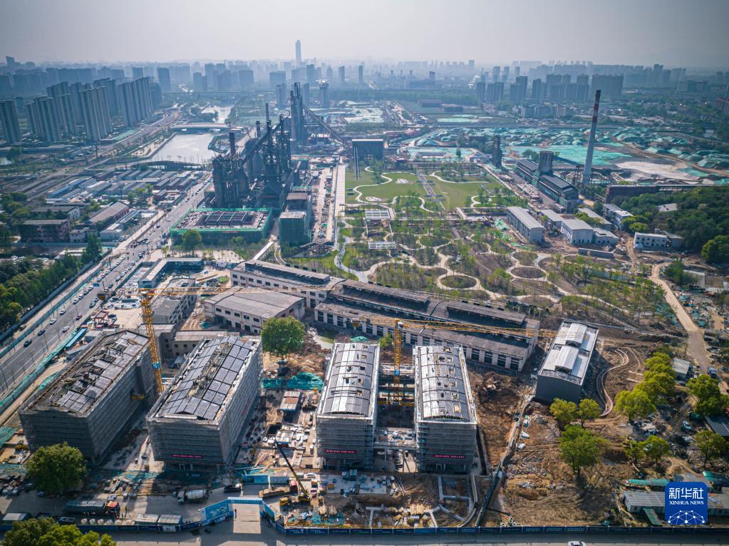 這是4月17日拍攝的建設中的杭鋼工業舊址公園全景(無人機照片)。