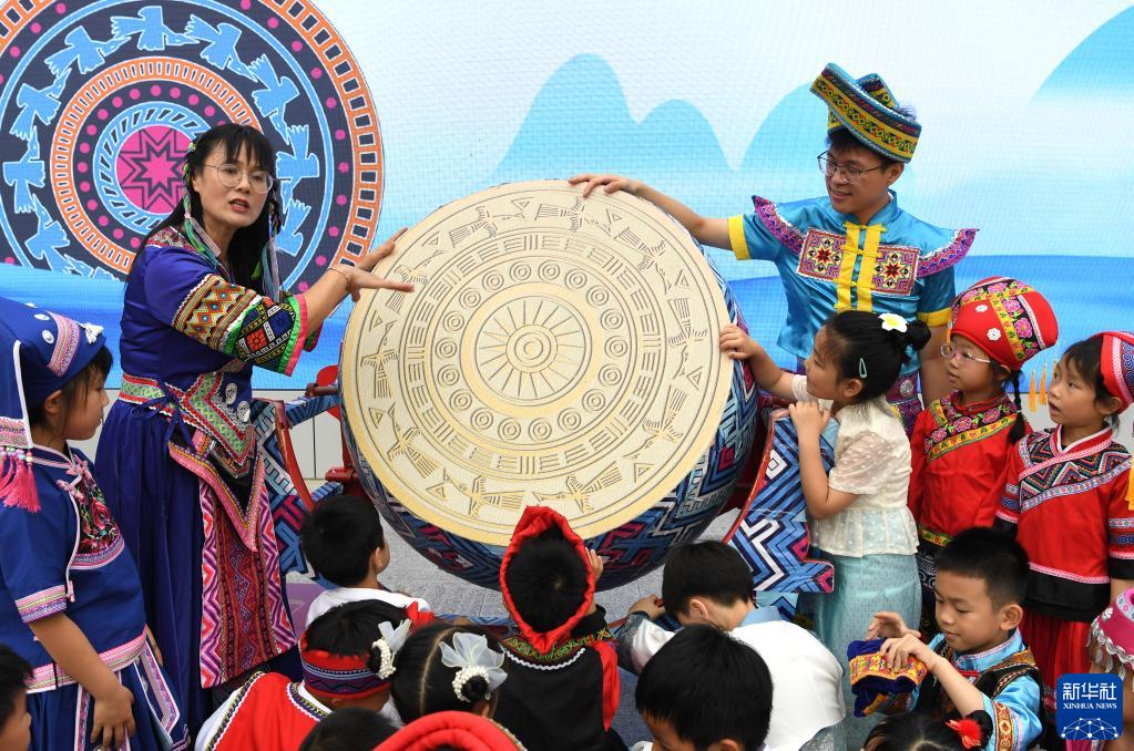 4月17日,一名老師在廣西南寧市濱湖路小學為孩子們講解銅鼓圖案。