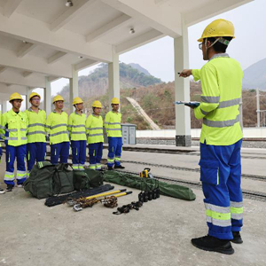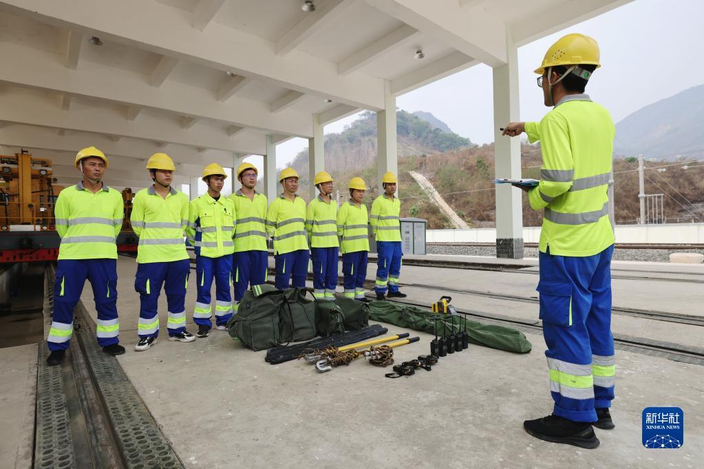 4月17日,瑯勃拉邦維保管理中心的工人在老撾瑯勃拉邦站附近進行接觸網維修保養演練。