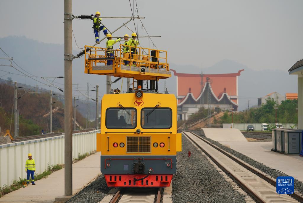 4月17日,瑯勃拉邦維保管理中心的工人在老撾瑯勃拉邦站附近進行接觸網維修保養演練。
