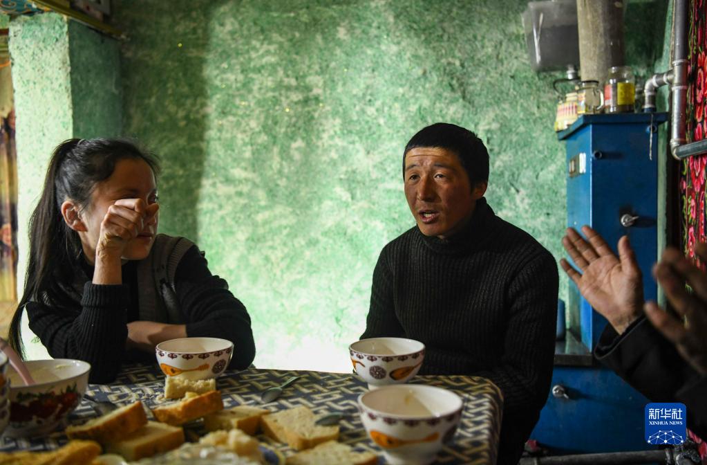 昆樹阿克當天要離家去烏魯木齊上大學,哥哥賽孜木在餐桌上即興唱起自編的祝福歌曲。昆樹阿克在一旁認真聆聽,在動情時擦拭眼淚(2月15日攝)。