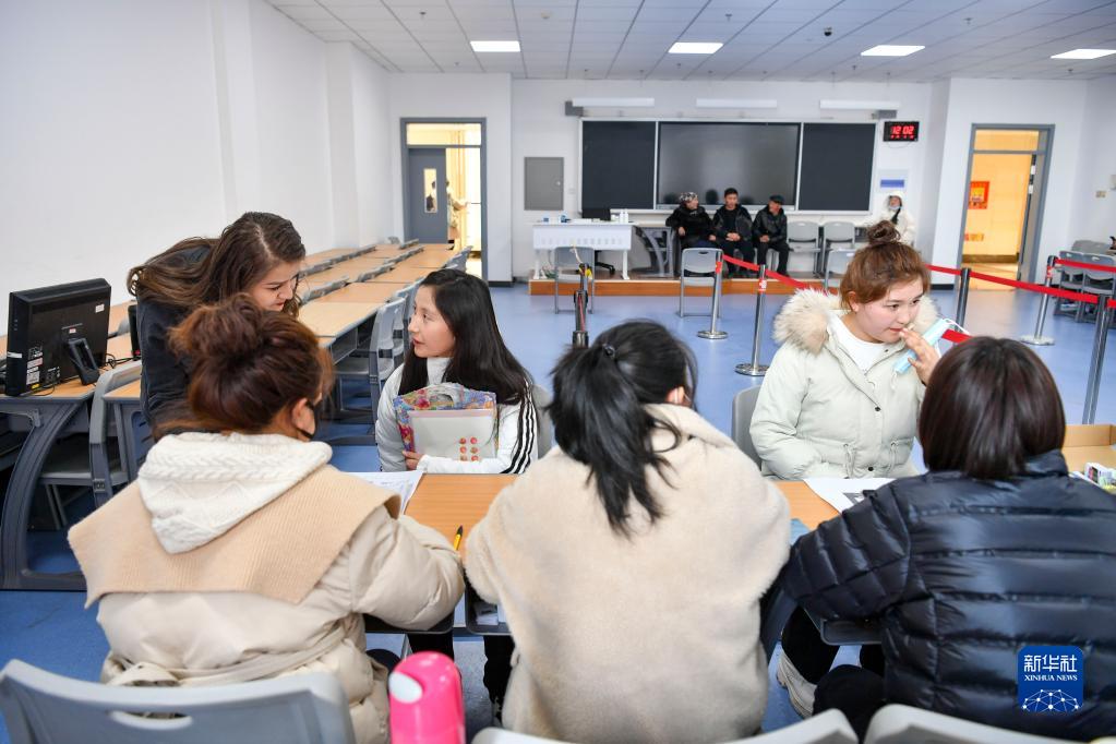 在新疆醫(yī)科大學(xué)(雪蓮山校區(qū))教學(xué)樓內(nèi),昆樹阿克(后排中)在辦理入學(xué)手續(xù),父母坐在不遠處等候(2月18日攝)。