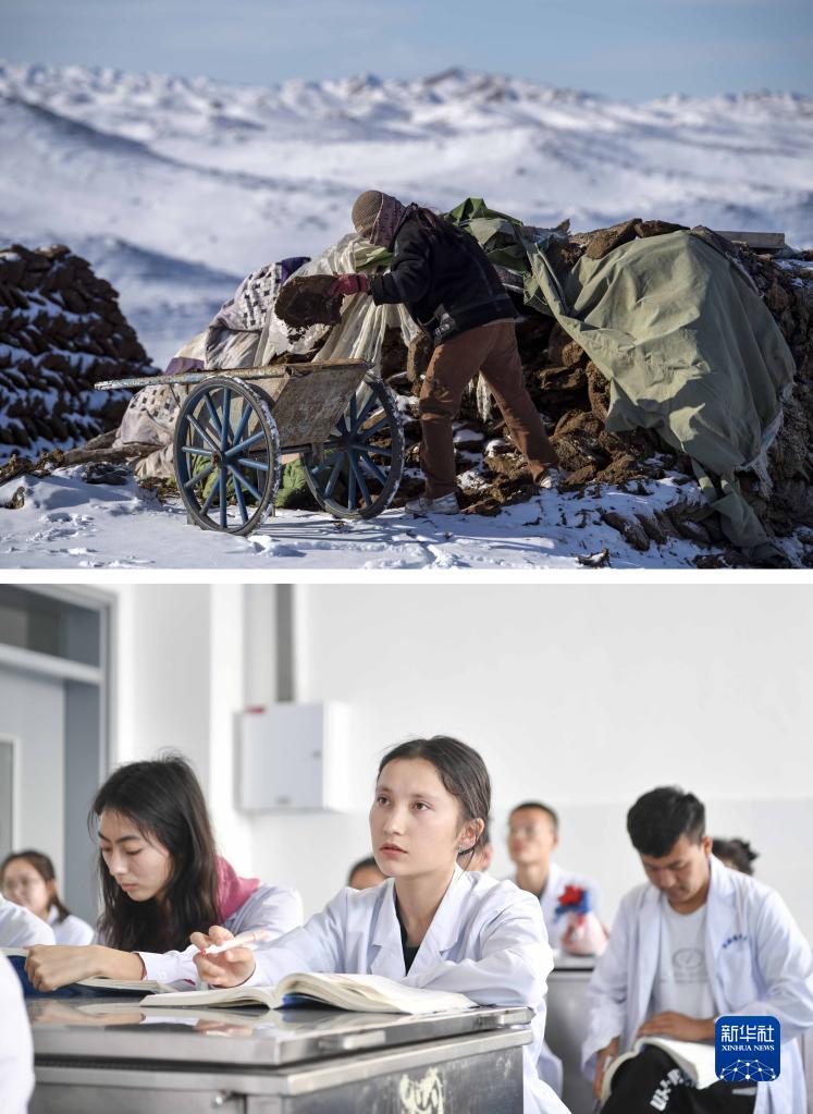 拼版照片:上圖為寒假時,昆樹阿克在家幫忙干活,撿拾牛糞用作取暖的燃料(2月14日攝);下圖為在新疆醫科大學(雪蓮山校區)1號實驗樓教室,昆樹阿克(中)和同學一起上系統解剖學課程(4月17日攝)。