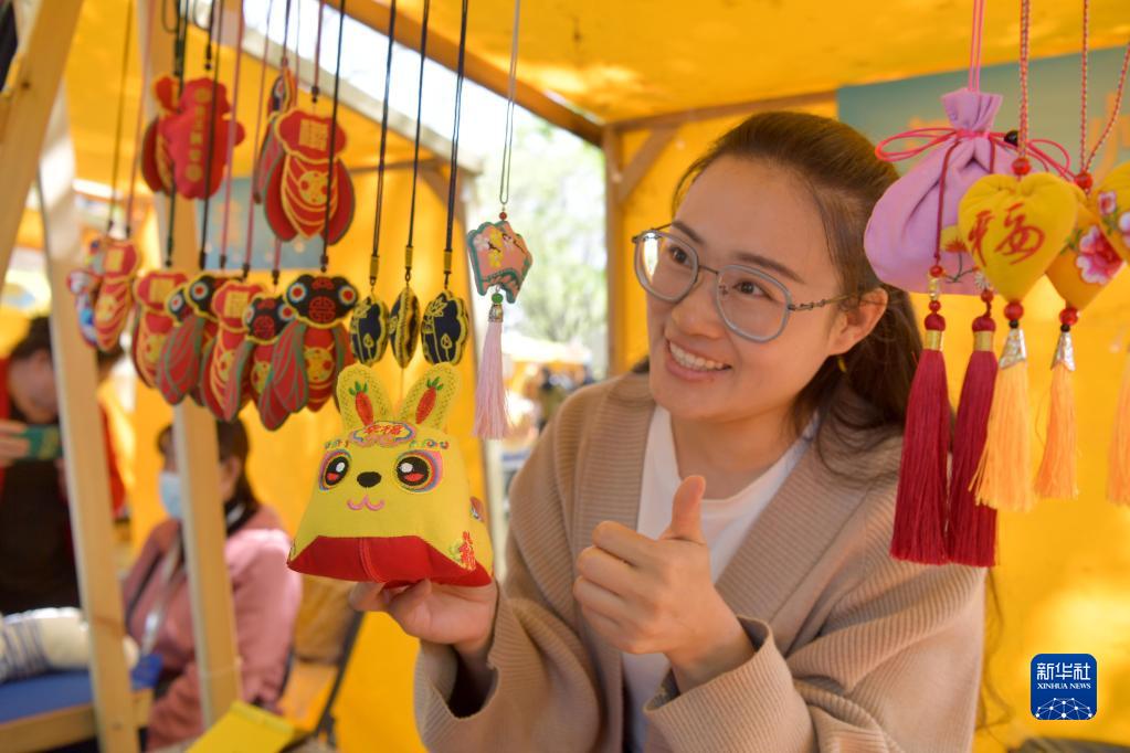 4月18日,非遺傳承人在東營市清風湖黃河大集上介紹絨繡兔。
