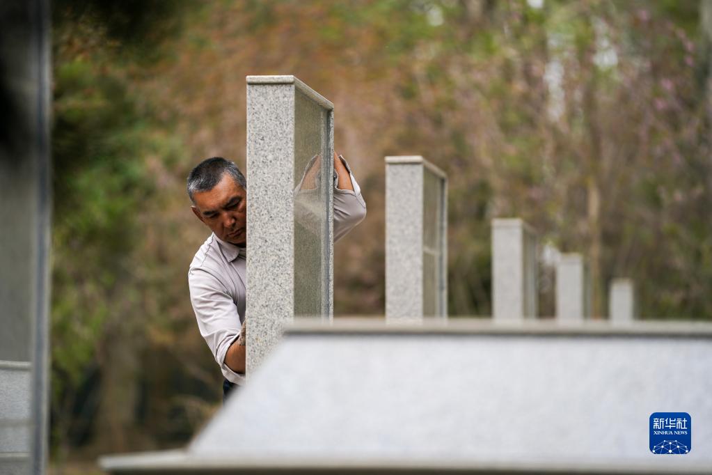 4月16日,艾尼瓦爾·艾買爾在新疆葉城烈士陵園擦拭墓碑。