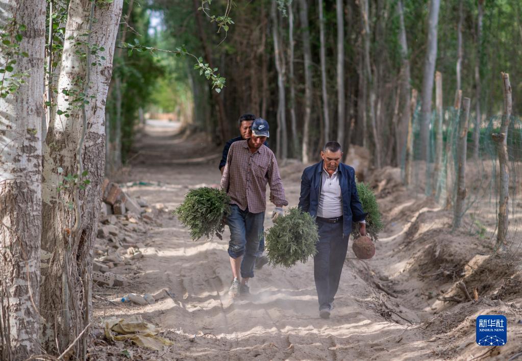 4月16日,在葉城縣一處種苗場,艾尼瓦爾·艾買爾(右)帶著柏樹苗走回烈士陵園。