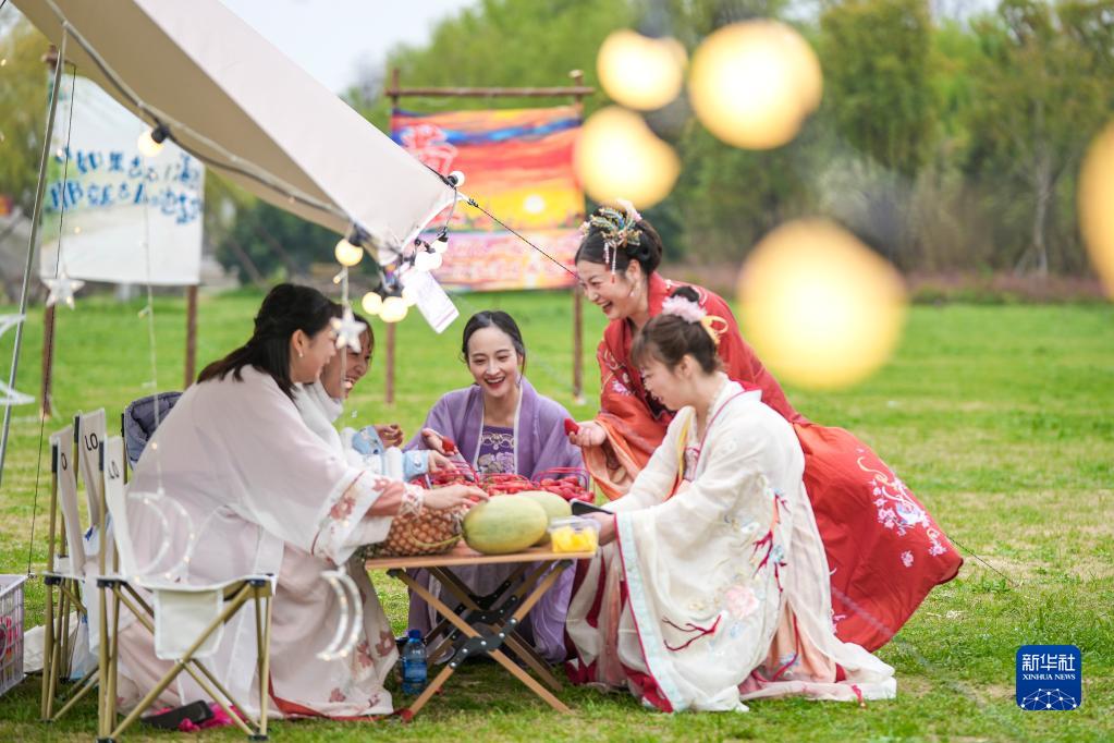 在浙江省湖州市長興縣太湖街道濱湖集市上,市民身穿漢服在草坪露營(3月29日攝)。
