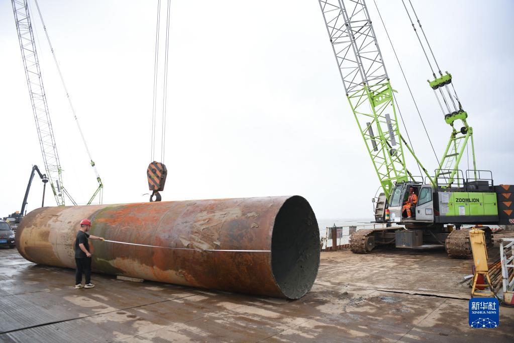 4月18日,工人在黃茅海跨海通道黃茅海大橋施工作業。
