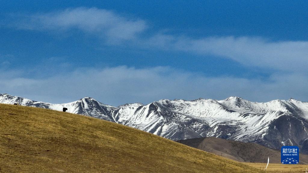 4月16日,在青海省海北藏族自治州門源回族自治縣皇城蒙古族鄉,一頭牦牛在祁連山腹地的草場上活動(無人機照片)。